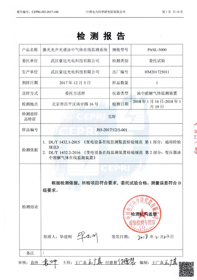 武漢豪邁光電科技有限公司傳來重大喜訊,公司研發(fā)的激光光聲光譜油中氣體在線監(jiān)測(cè)系統(tǒng)順利通過中國電科院試驗(yàn)檢測(cè),達(dá)到B級(jí)標(biāo)準(zhǔn),成功拿到準(zhǔn)入證。標(biāo)志著變壓器油氣測(cè)量進(jìn)入到激光檢測(cè)時(shí)代,具有跨時(shí)代的意義。