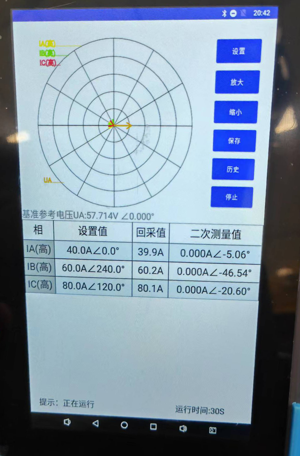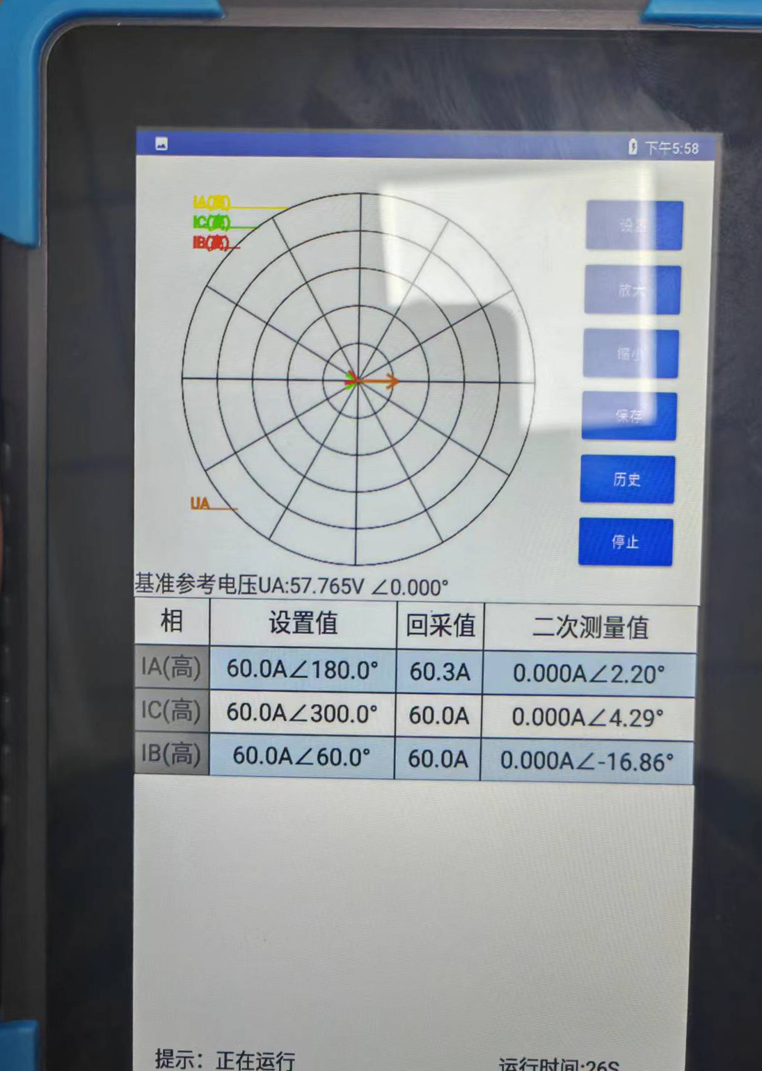 三臺HTA-1300 單相數(shù)字式智能大電流源正常運行后,A/B/C三相分別加40A、60A、80A電流,根據(jù)保護裝置主界面CT二次側(cè)采到的二次值幅值與相位0.02、0.04、0.06A,可知三相對應(yīng)。 CT變比為2000: 1,計算出CT與PT的變比基本與實際相同。 同時加三相60A電流 ,當(dāng)PT、CT的極性正常時,IA、IB、IC的電流是由線路流向母線間隔,二次側(cè)輸出相位應(yīng)與一次側(cè)的輸入相位差180°,所以加量時一次電流A/B/C相角度分別加180°、60°、300°時,二次值會顯示二次電壓與電流角度相同,對應(yīng)反極性,因此此線路極性正確。 電流A/B/C三相分別為40A、60A、80A,角度0°時,零序電流值為三相電流值之和,二次零序電流為0.09A,所以零序電流顯示正確,該線路間隔正常。