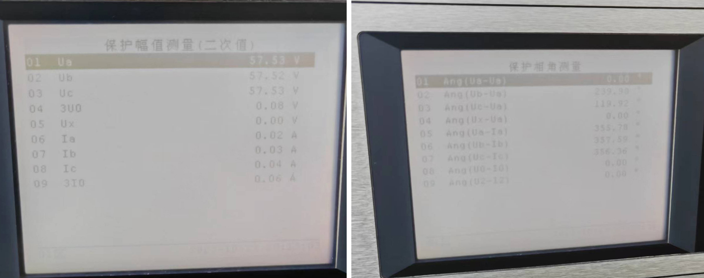 電流二次顯示A/B/C三相分別為0.02A/0.03A/0.04A,角度正序。