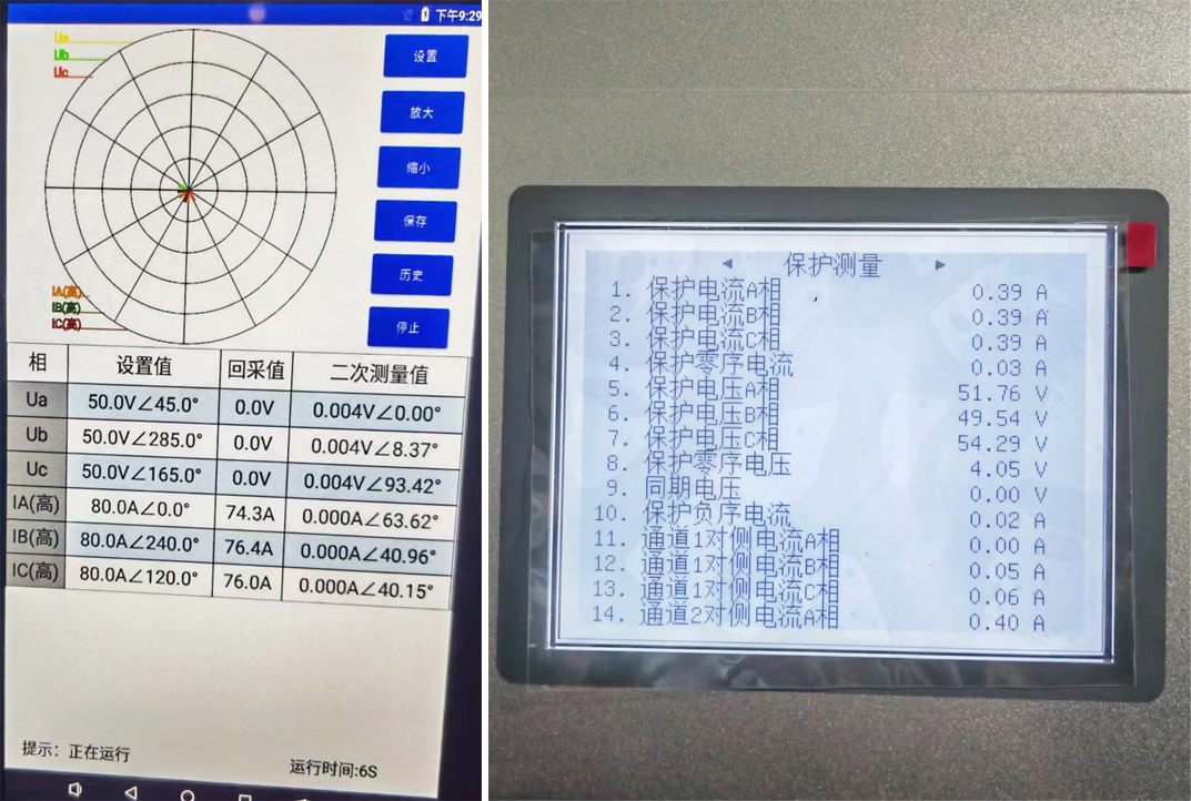 為了查看電流回路的絕對(duì)相角,需要施加二次電壓,通過HTV-6000 直接輸出額定電壓至保護(hù)裝置,以A相母線電壓為基準(zhǔn),可在各間隔保護(hù)裝置上查看CT二次幅值角度,根據(jù)CT極性端定義由此判斷向量極性是否正確。