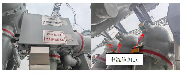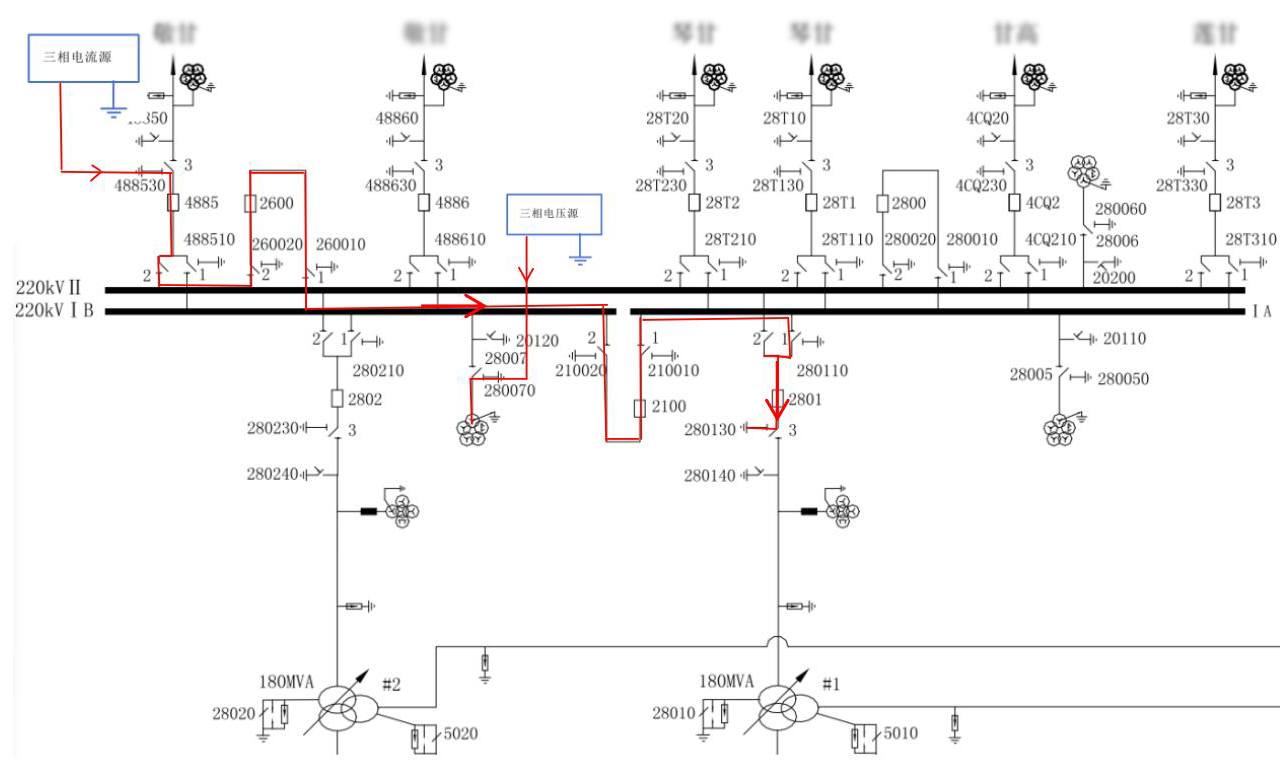 拆除220kV 4885線路間隔接地閘刀(488530閘刀)的接地連接點,試驗前需要斷開其它電流流經(jīng)回路的接地連接點,保證只有220kV #1主變間隔接地閘刀(280130閘刀)的一個接地連接點,從拆除點位置(488530閘刀)引線處將試驗線纜依次與三相電流源的A、B、C輸出端子連接,電流源的N線與接地銅排連接。 (上圖中紅線即為三相電流回路流向,開關(guān)、閘刀狀態(tài)如圖)。 488530、4885、48852、26002、2600、26001、21002、2100、21001、28011、280130在合閘位置,與220kV母線連接的隔刀均斷開,其余刀閘及地刀均在分閘位置。