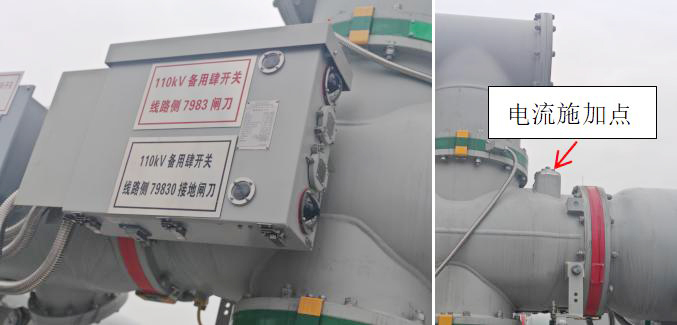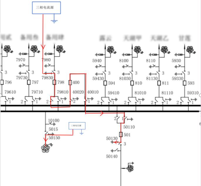 798開關(guān)間隔距離電源檢修箱位置較近取電方便,選取為通流點。 拆除110kV 798線路間隔接地閘刀(79830閘刀)的接地連接點,試驗前需斷開其它電流流經(jīng)回路的接地連接點,保證只有#1主變110kV 間隔接地閘刀(50130閘刀)的一個接地連接點,從拆除點位置(79830閘刀)引線處將試驗線纜依次與三相電流源的A、B、C輸出端子連接,電流源的N線與接地銅排連接。 (上圖紅線即為三相電流回路流向,開關(guān)、閘刀狀態(tài)如圖)。 79830、798、7982、4002、400、4001、5011、501、50130在合閘位置,其他與110kV母線連接的隔刀均斷開,其余刀閘及地刀均在分閘位置。