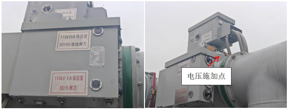 拆除110kVⅠ母A段壓變間隔接地閘刀(50150閘刀)的接地連接點,將電壓源輸出端子分別與Ⅰ母A段壓變電壓施加點連接,按A、B、C接地依次接入到對應(yīng)端子,上圖紅線即為三相電壓回路接線,開關(guān)、閘刀狀態(tài)如圖,斷開刀閘50150。 (短接智能終端5015輔助接點,使保護(hù)裝置能采到母線電壓)。 50150在合閘位置,5015在分閘位置。