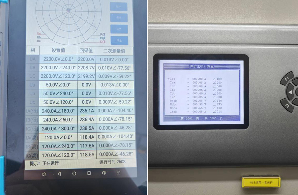 220kV與110kV側(cè)電流電壓源的運行設(shè)置選擇為遙控模式,用YD-300E 智能電流電壓源無線遙控主機(jī)搜索對應(yīng)設(shè)備,連接完成后設(shè)置輸出幅值與角度,返回遙控主界面,點擊開始,即可控制已連接裝置進(jìn)行輸出,施加差流平衡量進(jìn)行輸出。