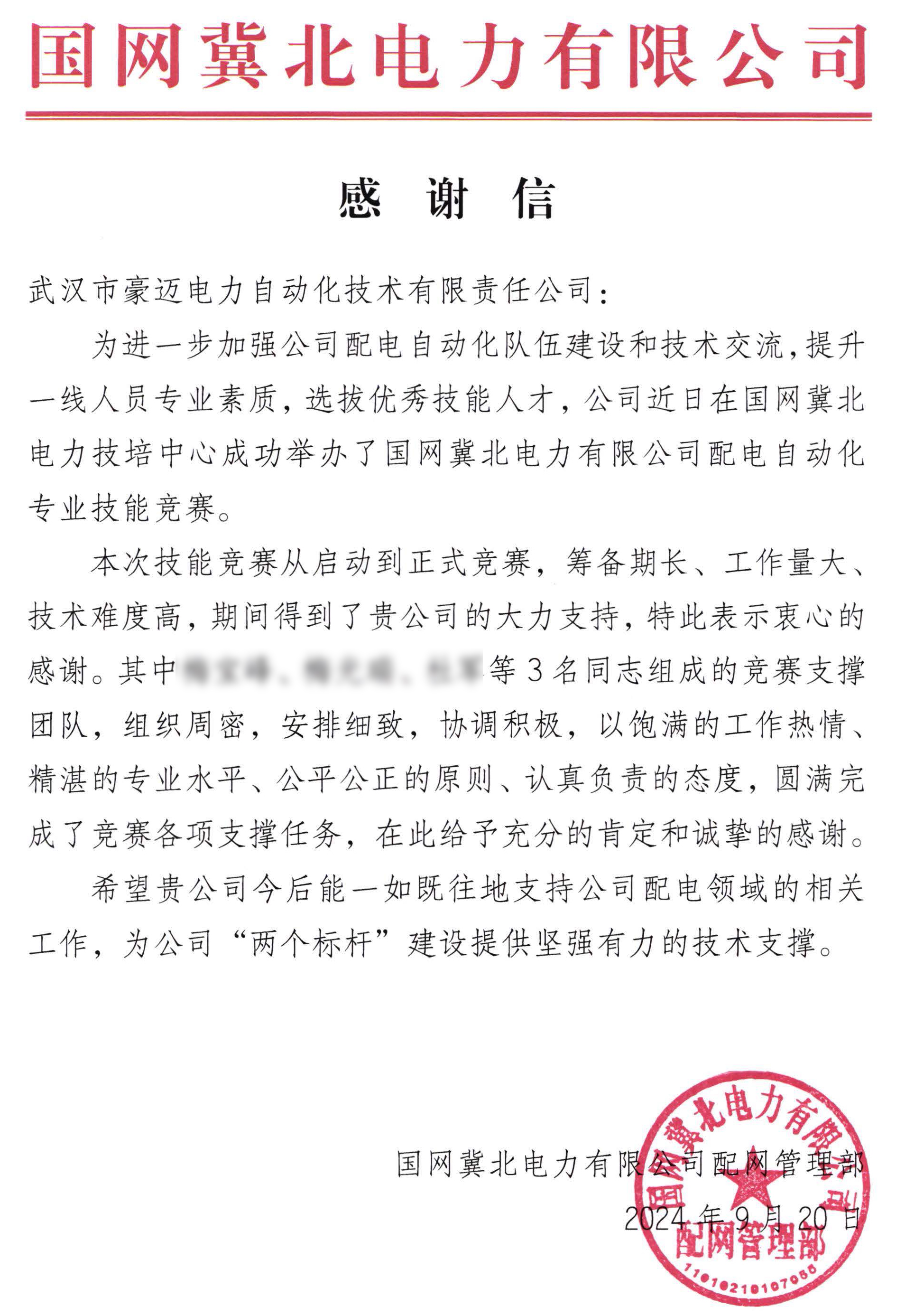 近日,武漢豪邁收到國網(wǎng)冀北電力發(fā)來的感謝信,信中對(duì)武漢豪邁安排員工“組成競賽支撐團(tuán)隊(duì),組織周密,安排細(xì)致,協(xié)調(diào)積極,以飽滿的工作熱情,精湛的專業(yè)水平、公平公正的原則、認(rèn)真負(fù)責(zé)的態(tài)度,圓滿完成了競賽各項(xiàng)支撐任務(wù),給予充分的肯定和誠摯的感謝”。字里行間蘊(yùn)藏著客戶對(duì)我司產(chǎn)品品質(zhì)、技術(shù)實(shí)力、服務(wù)能力的高度認(rèn)可與滿滿信任,既是榮譽(yù),也是鞭策,更是動(dòng)力。
