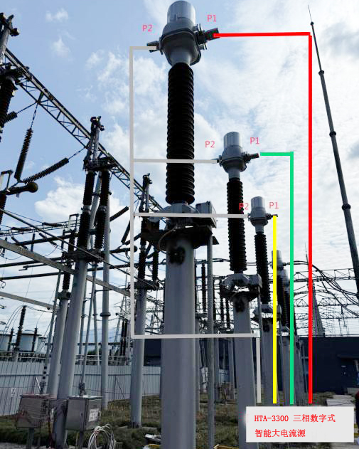 HTA-3300?三相數(shù)字式智能大電流源一次試驗線應(yīng)可靠連接分段224開關(guān)CT一次側(cè)極性端P1,一次通流經(jīng)過CT后從P2流出,形成“P1—CT—P2”可靠回路(見下圖)。
