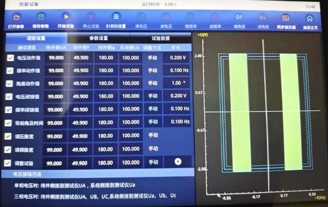 繼保之星-Z70 手持式數(shù)模一體繼電保護(hù)測(cè)試儀 同期試驗(yàn)功能模塊可測(cè)試同期繼電器或同期裝置的動(dòng)作電壓、動(dòng)作相角和動(dòng)作頻率,進(jìn)行自動(dòng)準(zhǔn)同期調(diào)整試驗(yàn)。 下面介紹如何使用繼保之星-Z70 完成同期裝置的預(yù)防性試驗(yàn),校驗(yàn)是否滿(mǎn)足同期合閘條件。