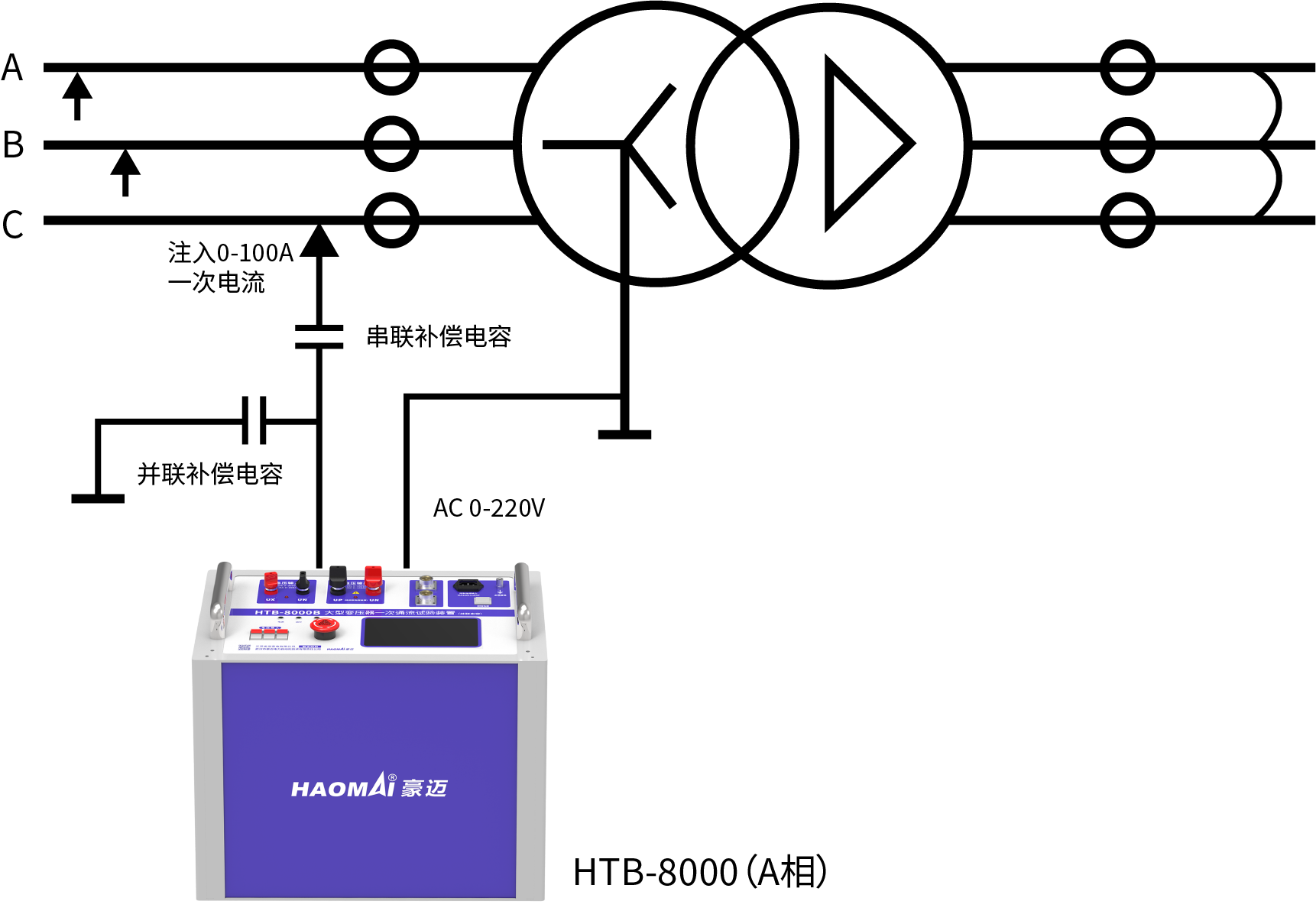 HTB-8000 通過串聯(lián)電容補(bǔ)償來抵消變壓器的激磁感抗,采用380V/220V電源從變壓器中壓(或高壓)Y側(cè)一次繞組(CT外側(cè))注入100A電流,其他側(cè)分別短接(CT外側(cè)),變壓器各側(cè)一次繞組均有電流流過CT,CT二次回路所產(chǎn)生的電流即可用于對(duì)變壓器保護(hù)進(jìn)行向量檢查。