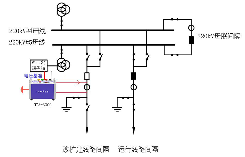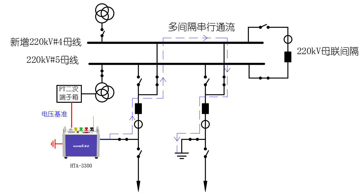 對于新增一條母線的工程,可以采用HTA-3300 串行通流的方法檢查新增間隔及母線保護(hù)向量正確性,裝置取一基準(zhǔn)電壓同步輸出0-300A電流加到新增母線某一支路CT一次側(cè),從新增母線另一間隔出線側(cè)流出,通過操作開關(guān),可完成母線所有支路間隔的穿越短路試驗(yàn),實(shí)現(xiàn)新增間隔及母線保護(hù)向量檢查。