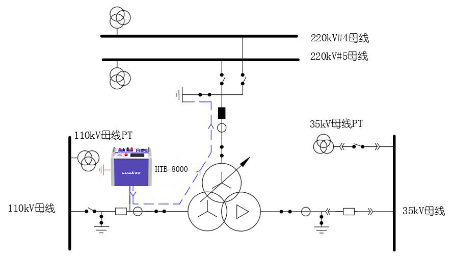 HTB-8000 通過串聯(lián)電容補(bǔ)償來抵消變壓器的激磁感抗,采用380V/220V電源從變壓器中壓(或高壓)Y側(cè)一次繞組(CT外側(cè))注入100A電流,其他側(cè)分別短接(CT外側(cè)),變壓器各側(cè)一次繞組均有電流流過CT,CT二次回路所產(chǎn)生的電流即可用于對變壓器保護(hù)進(jìn)行向量檢查。