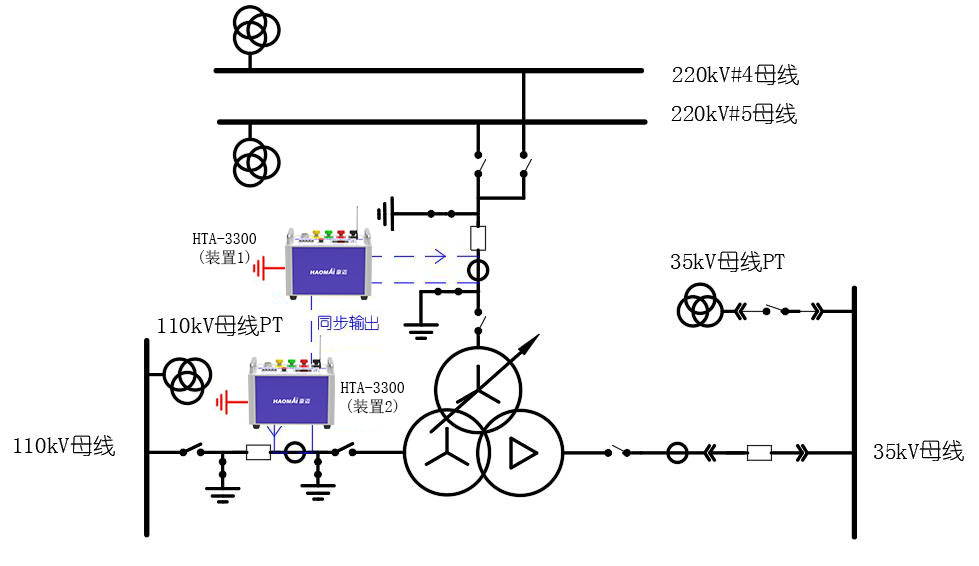 對于無需進(jìn)行變壓器套管CT通流的試驗(yàn),可以采用兩臺HTA-3300在主變兩側(cè)同步通流,外接基準(zhǔn)電壓作為參考檢查單側(cè)向量,也可以通過差動電流進(jìn)行兩側(cè)向量檢查。
