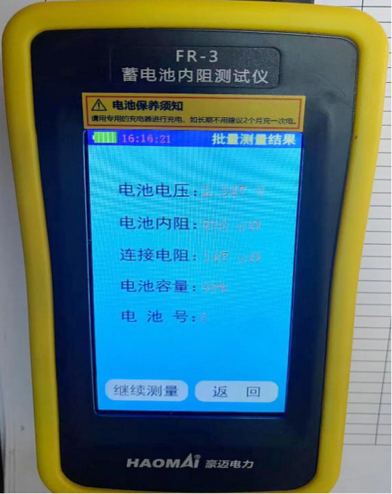 選擇其中一種接線方式接線完成后,點(diǎn)擊開始測(cè)試,通過測(cè)得的電壓、電阻、電池容量及連接片的阻值,判斷電池的性能和連接情況,迅速排查出是電池連接片沒擰緊,造成電路阻抗過高引發(fā)告警,立即快速處理,最大程度上減小影響。