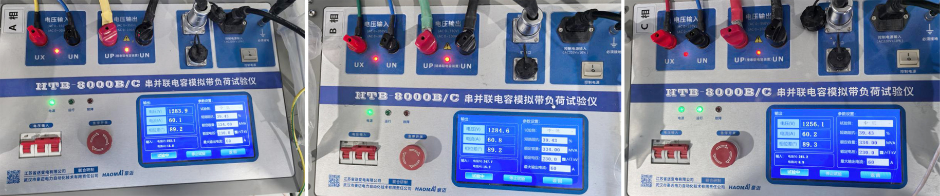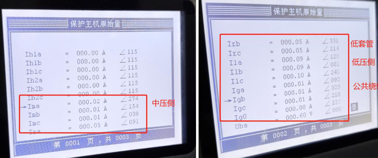 本次使用HTB-8000 大型變壓器一次通流試驗裝置對500kV主變差動保護進行向量檢查,從一次側(cè)升壓,利用變壓器本身短路阻抗實現(xiàn)穿越通流,一次性實現(xiàn)對主變高(中)壓側(cè)外附CT、套管CT、公共繞組CT以及低壓側(cè)外附CT、套管CT通流,驗證主變縱差保護、分相差動保護、分側(cè)差動保護以及低壓側(cè)小區(qū)差動保護向量正確性,通過差流大小即可判斷主變保護向量極性是否正確,大大提高送電效率。