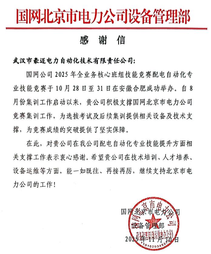 近日,武漢豪邁接連收到國網(wǎng)河南省電力、國網(wǎng)北京市電力發(fā)來的感謝信,信中高度肯定并感謝我司對國網(wǎng)公司2025年全業(yè)務(wù)核心班組技能競賽配電自動化專業(yè)技能競賽集訓(xùn)工作的積極支撐。客戶在信中表示,武漢豪邁為選拔考試及集訓(xùn)提供相關(guān)設(shè)備及技術(shù)支撐,為競賽成績的突破提供了堅實保障,并對公司在技術(shù)培訓(xùn)、人才培育及競賽支撐方面展現(xiàn)出的專業(yè)能力與責(zé)任擔當表示高度贊賞。